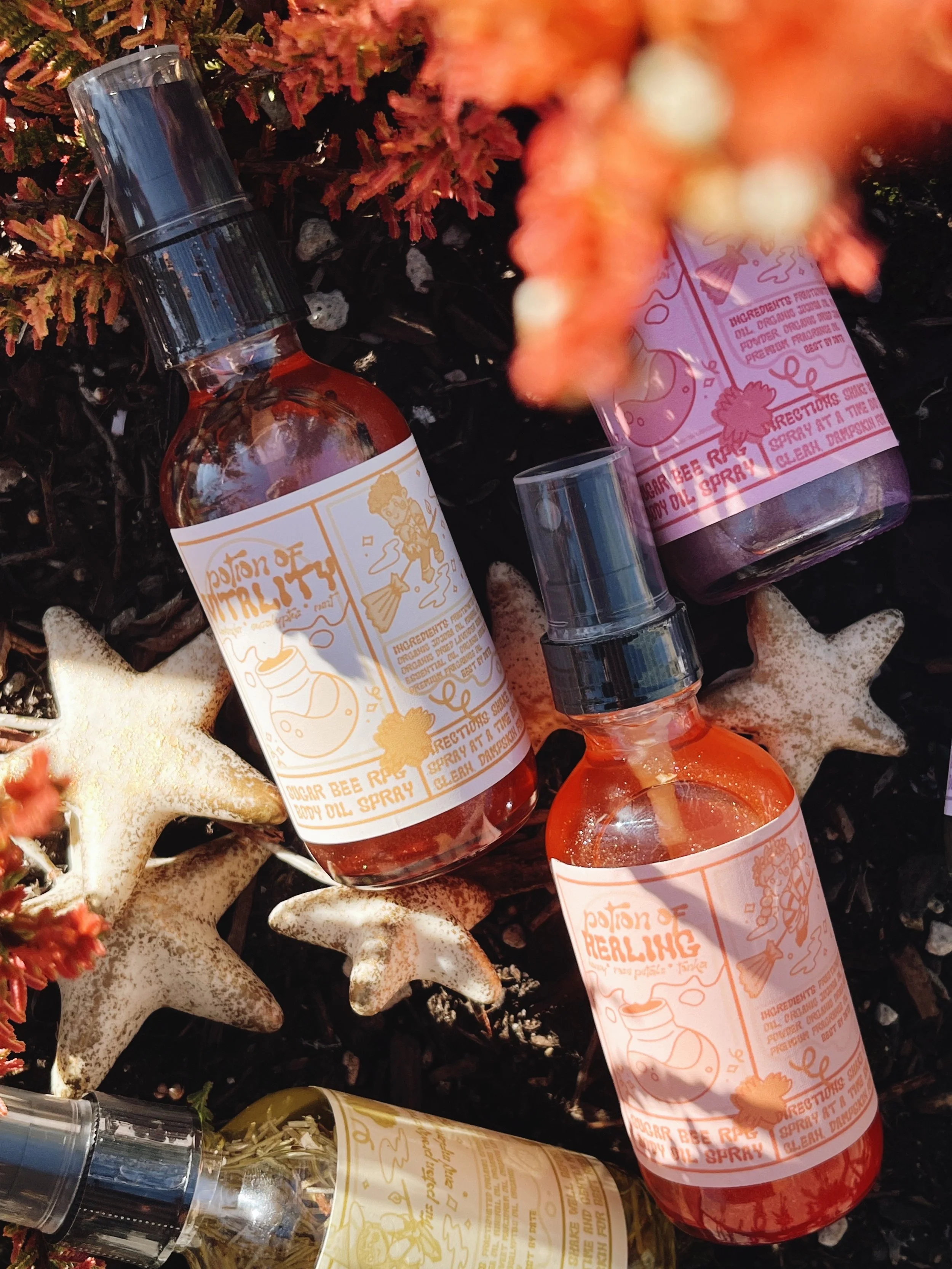 For the 2023 spooky season, I've created six limited edition packaging designs for Sugar Bee RPG's self-care collection, primarily focusing on their body oil sprays. Every packaging label was created with each "potion" in mind, with me illustrating an unique witch and familiar to match the potion's color palette and theme, adding a special layer of personalization. Above are examples!